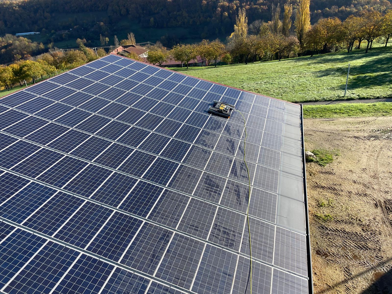 est réalisé par un agent de terrain formé à l’usage d’un robot radiocommandé spécialement conçu pour le nettoyage des panneaux solaires. À l’aide de brosses rotatives douces et de systèmes d’arrosage, il élimine la saleté et la poussière accumulée sans compromettre l’intégrité de la surface des panneaux. Il est capable de nettoyer rapidement de grandes surfaces de panneaux photovoltaïques, ce qui en fait une solution idéale pour les toitures solaires ou les grandes surfaces d’ombrières.